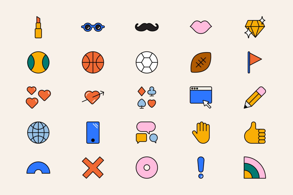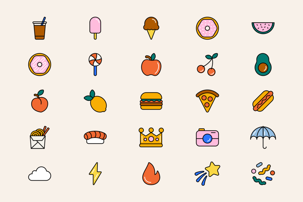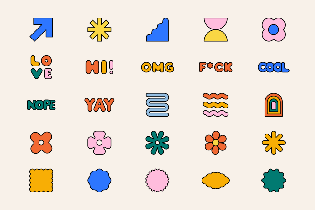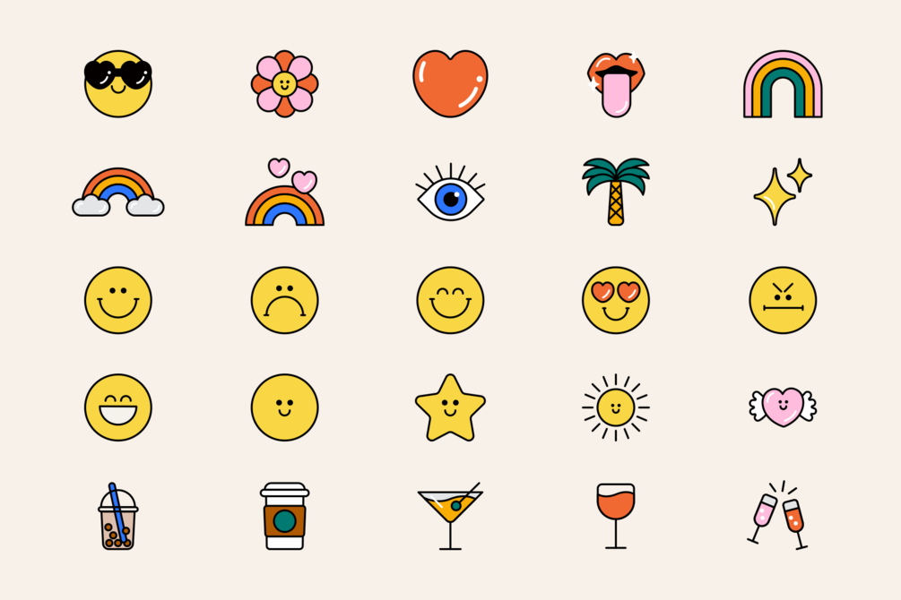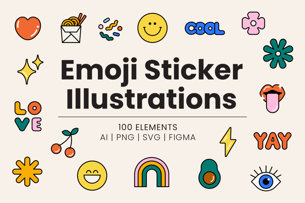 This fun set of emoji stickers can be used for products, branding, social media, patterns, and more. Illustrator and Figma files include vector shapes for you to change color, strokes, and scale at any size.