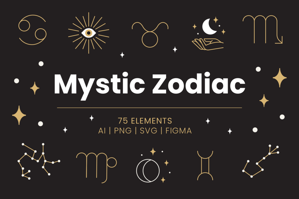 These mystical zodiac illustrations can be used for products, branding, social media, patterns, and more. Illustrator and Figma files include vector shapes for you to change color, strokes, and scale at any size.